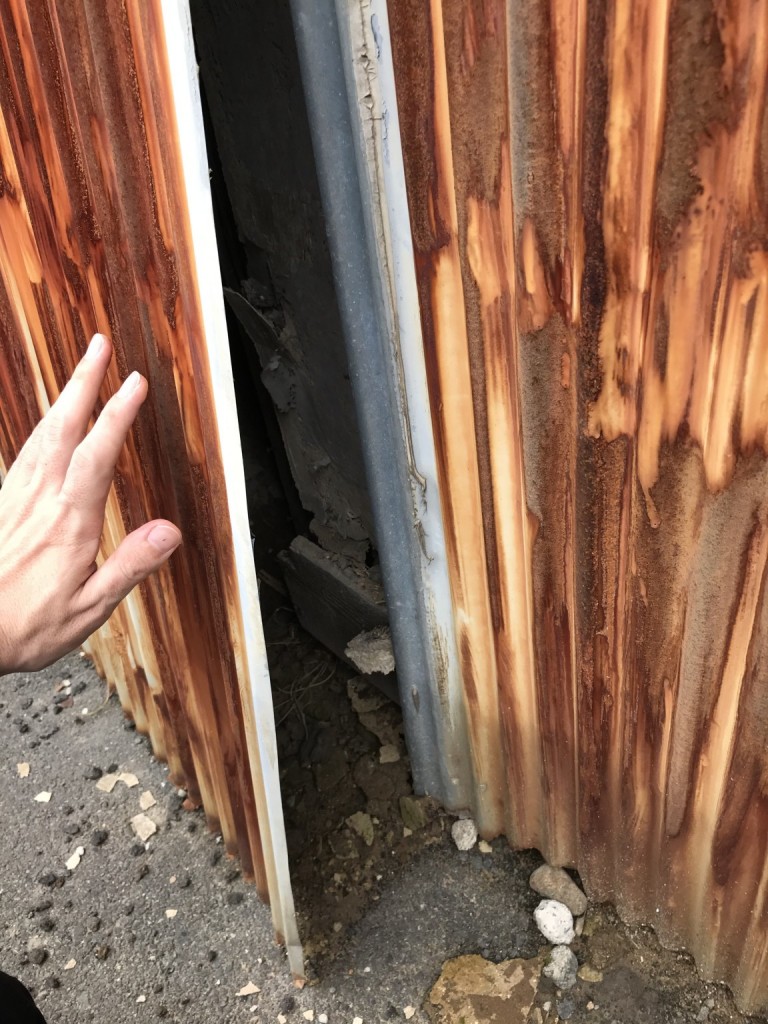 その右側の古い外壁板金の下の方が膨らんでいます。