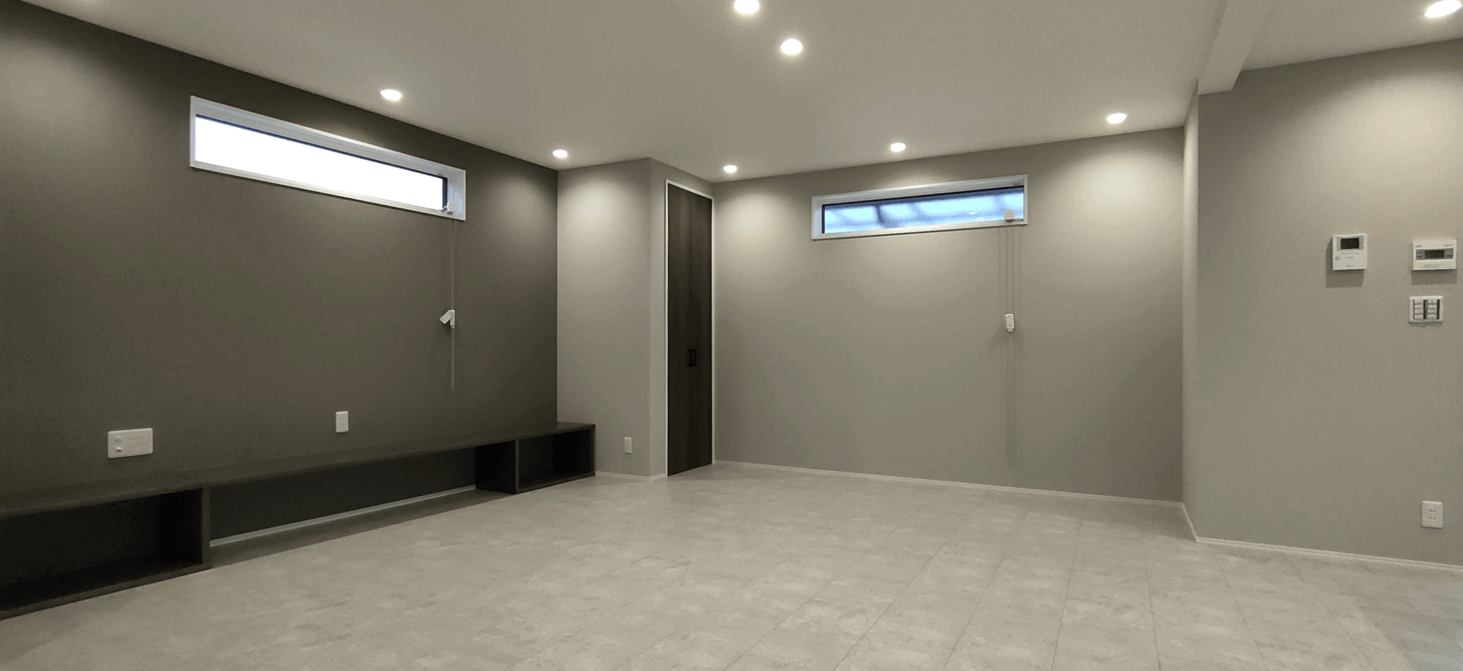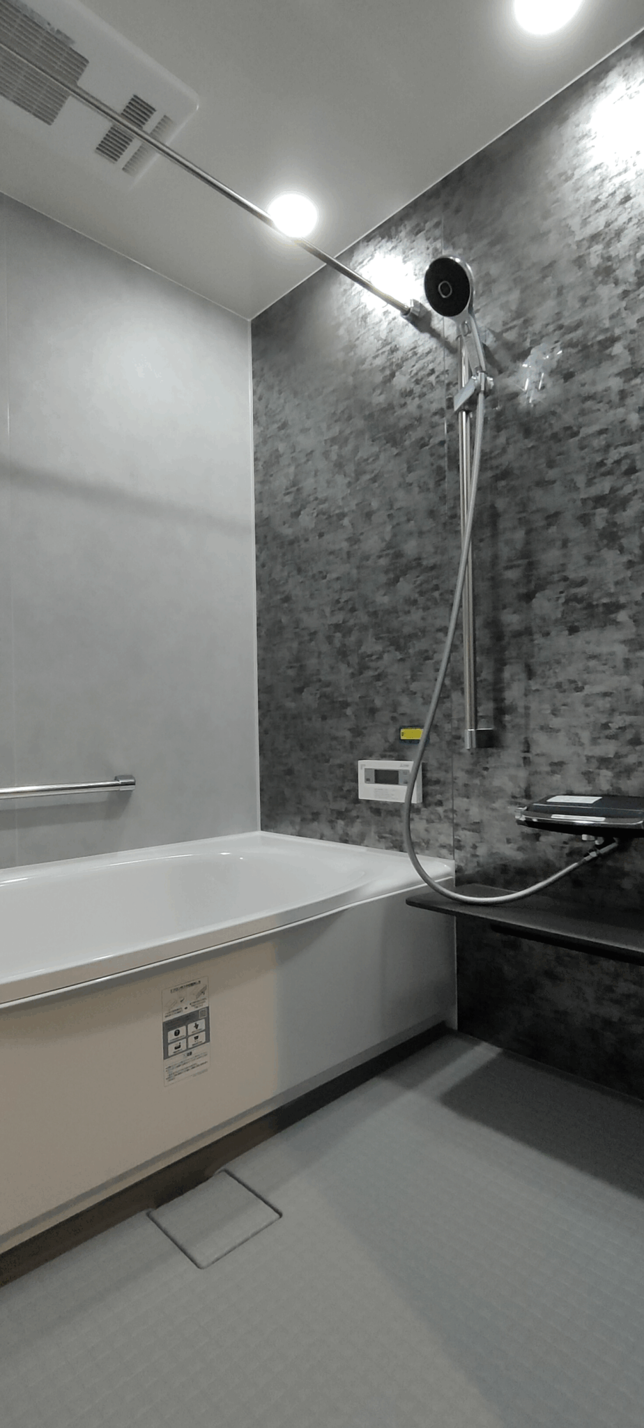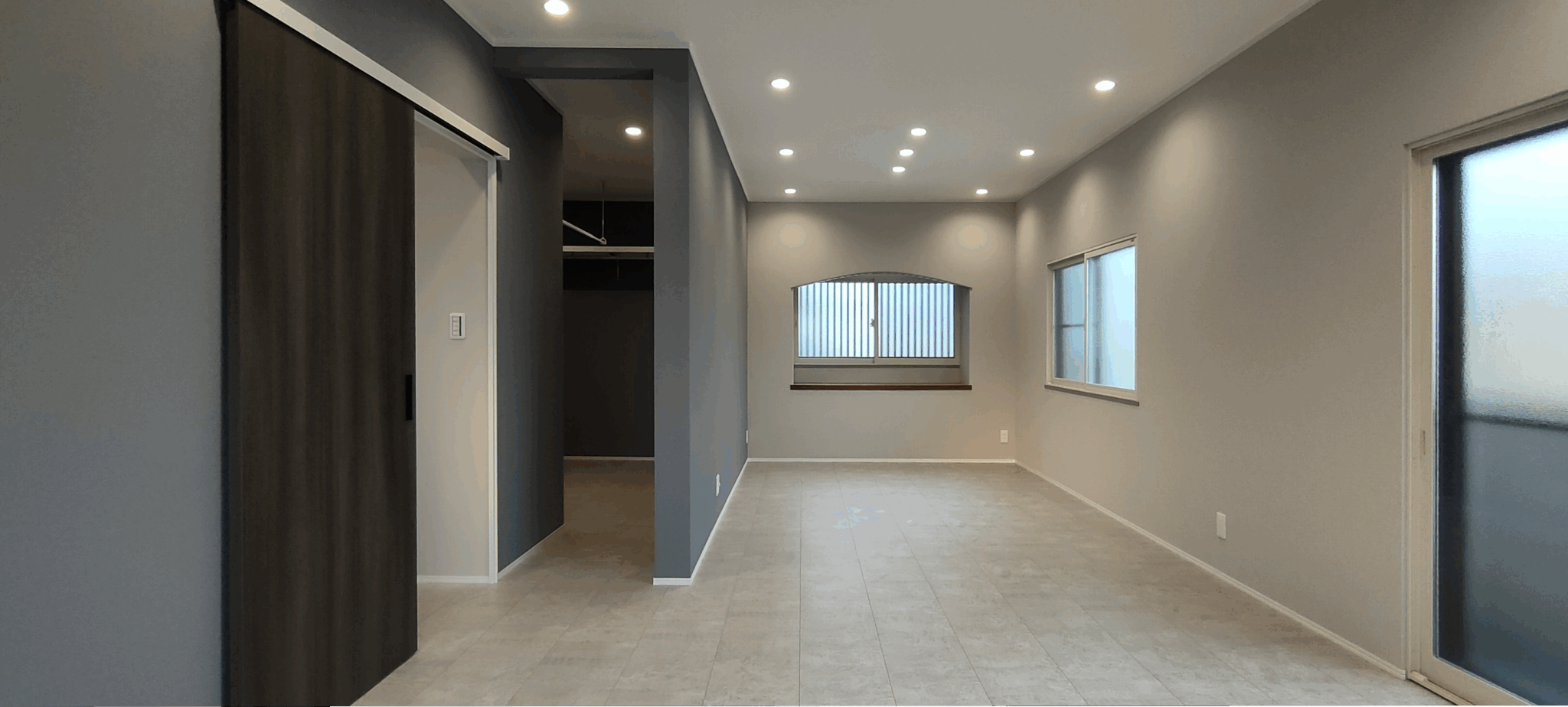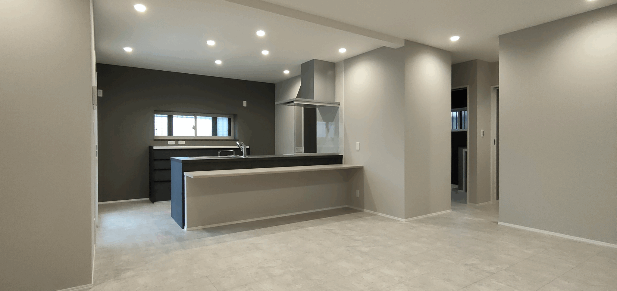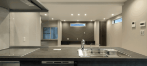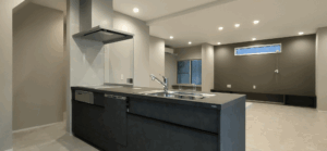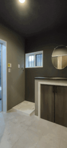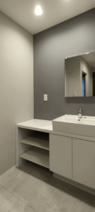 ホテルライクなグレイッシュトーンで統一した、洗面、浴室、トイレ。LDKからつながる回遊動線上にスマートに配置し、デザイン性だけでなく、日々の使いやすさにもこだわりました。 LDKの一角に配置した洗面カウンターは使い勝手はもちろんですが、インテリアの一部としても存在感を感じます。