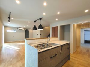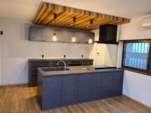 こちらのお家では、折り下げ天井のキッチンにペンダントライトを採用いただきました。