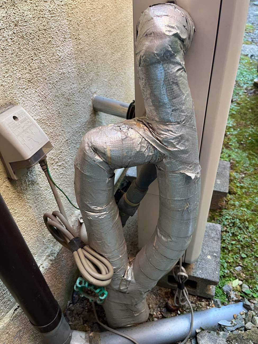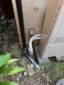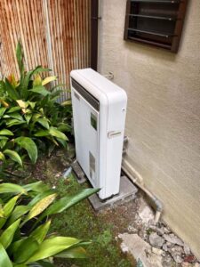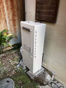新しい給湯器は壁かけタイプの機種ですが、外壁が給湯器の重みに耐えられない可能性があったので、専用の置台の上に設置する方法で工事を行いました。