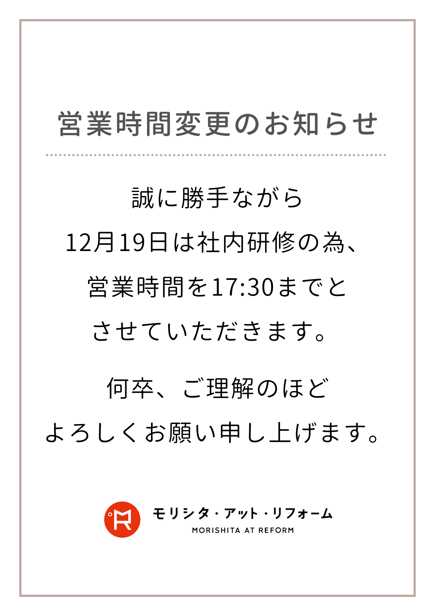 臨時閉店のお知らせ 2025-12-17 by staff Tweet こんにちは。 営業サポート部の直井です。 早速ですが、お知らせです。 12月19日(金)は、社内研修の為、17:30にて閉店させていただきます。 お客様にはご迷惑をおかけいたしますが、何卒ご理解の程よろしくお願いいたします。 関連記事9月9日(日)10:00~16:00『外壁塗り替えキャンペーン』開催!姫路市N様邸 トイレ新設工事完成しました。12月後半より店舗改装をおこないます!明日は定休日です。 Tweet