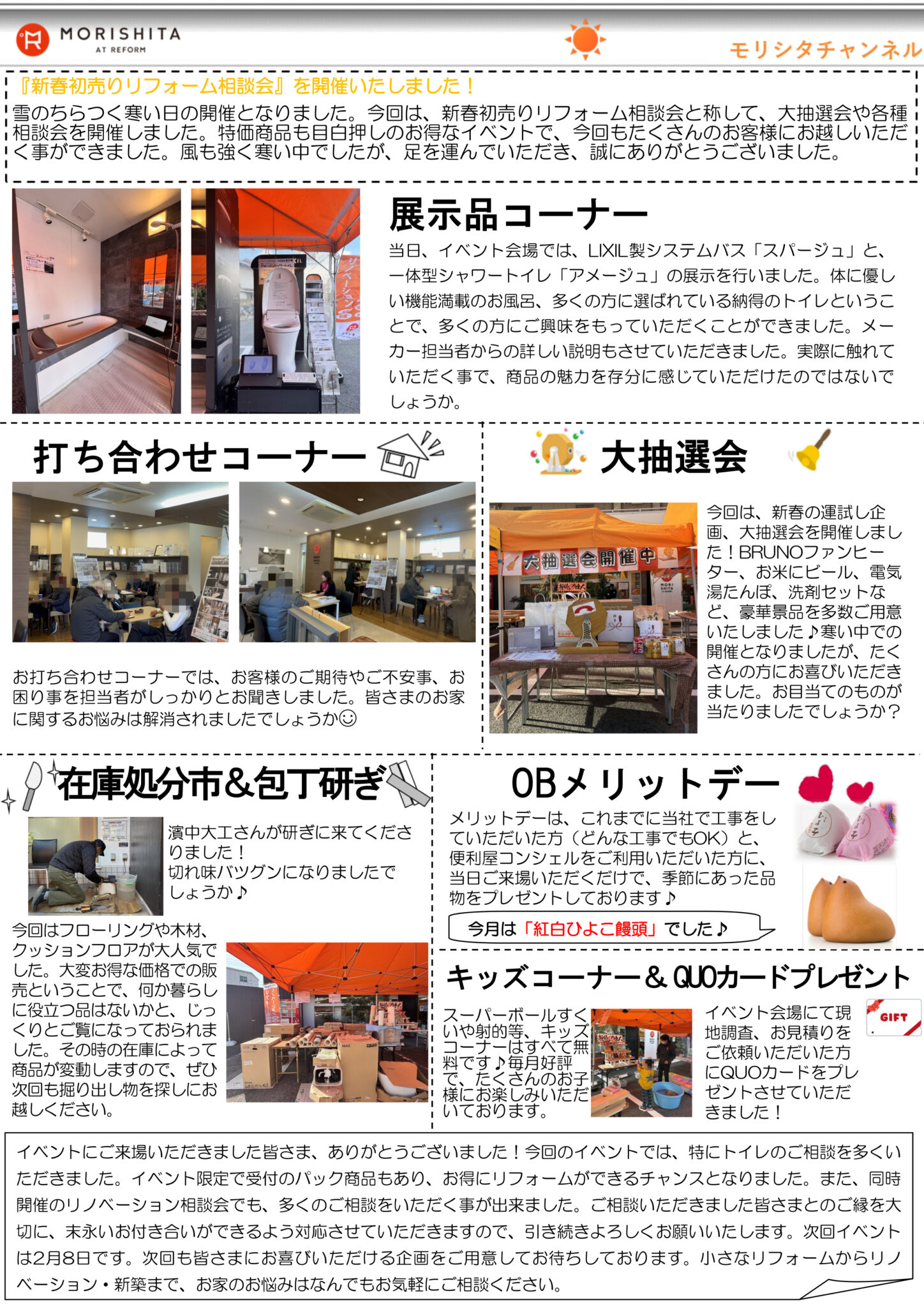 1/11(日)新春初売りリフォーム相談会 2026-01-12 by staff Tweet 関連記事姫路市 H様邸の改装工事開始しました!姫路市K様邸 雨漏り補修および和室天井補修工事完成!!姫路市 H様邸 トイレ取替え工事モデルハウス見学! Tweet