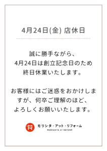4月24日(金)は、創立記念日の為、終日休業させていただきます。