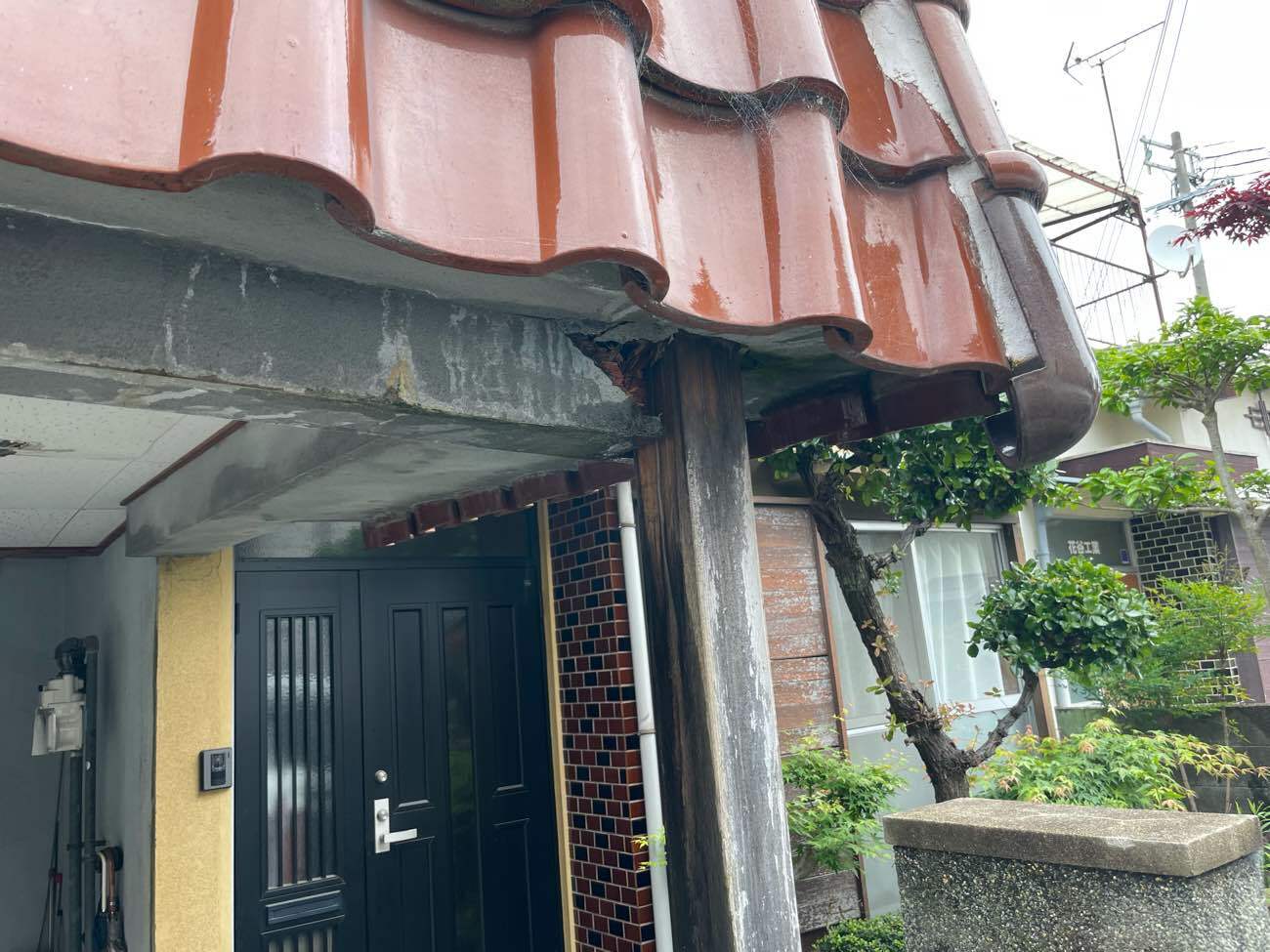 築50年以上の木造住宅で雨漏りによる軒天復旧工事を行いました。 夜中に大きな音がして外を見ると大きなモルタルの破片が落ちていると 驚きになられ早く見に来てとご連絡いただきました。 急いで駆け付けると軒天上のモルタルが地面や1階の屋根の上に落ち 一緒に雨どいも破損している状況でした 下地の木材も不朽していたので屋根を確認すると板金屋根の釘部分から 長年にわたり雨漏りしていました。 工事前![]()