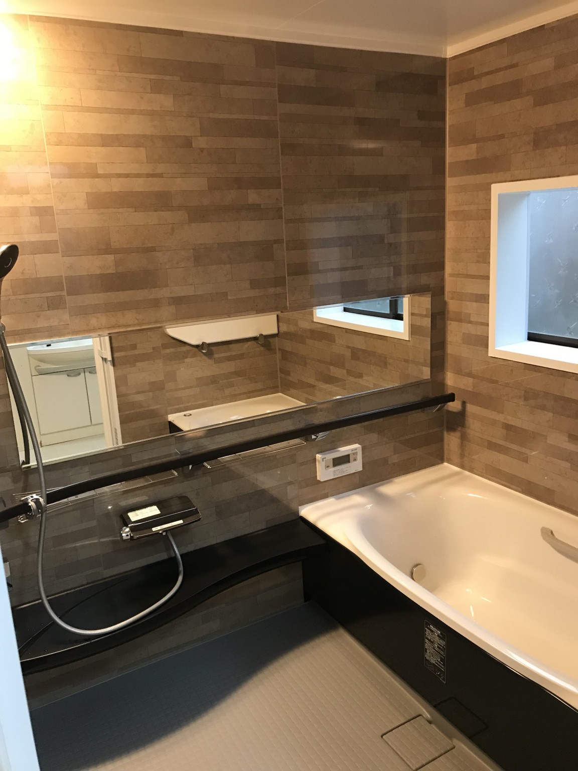 こんにちは。店長の佐伯です。今回は約20年使用されたシステムバスの入れ替え工事を行いました。 全体的に落ち着いた雰囲気のシステムバスに入れ替えしました。 ワイドミラーとサポートバー(手すり)が特徴です。 入り口は開口間口を広くとれる2枚片引き戸を採用しました。 また今回は窓サッシは交換しなかったのですが、断熱の為に内窓を取付しました。 |